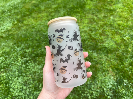 Halloween frosted beer can with straw and bamboo lid