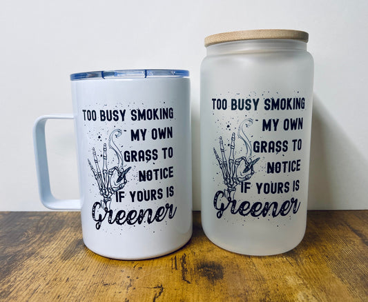 Grass is greener glass beer can with lid and straw or stainless mug with handle