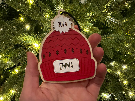 Personalized Winter Hat Ornament – 2-Layer Baltic Birch with Suede Cord