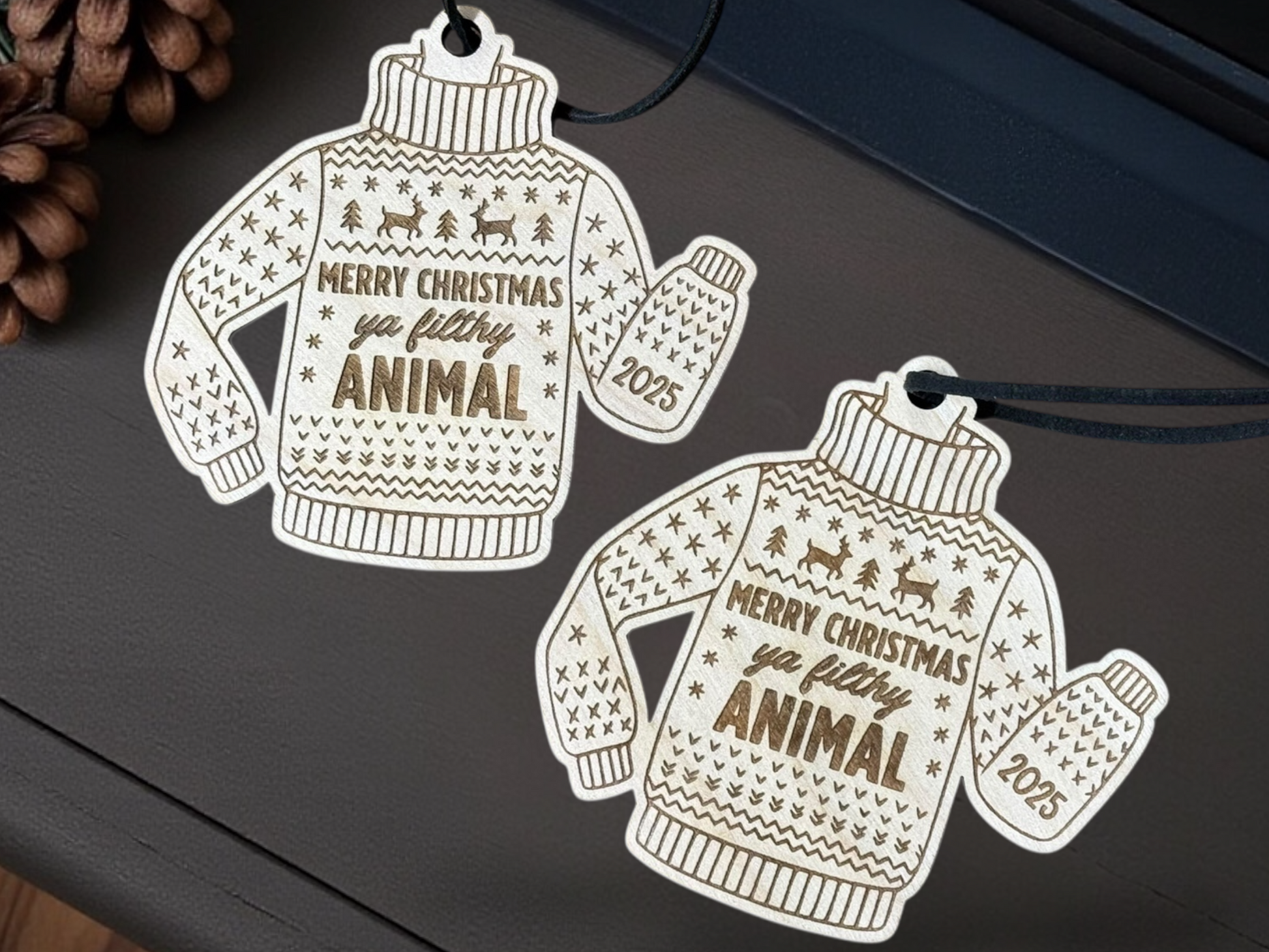 Add a touch of humor and nostalgia to your holiday decor with this Merry Christmas Ya Filthy Animal sweater ornament! Inspired by classic Christmas movie vibes, this detailed laser-engraved design is cut from smooth birch wood and finished with a black suede cord for hanging.