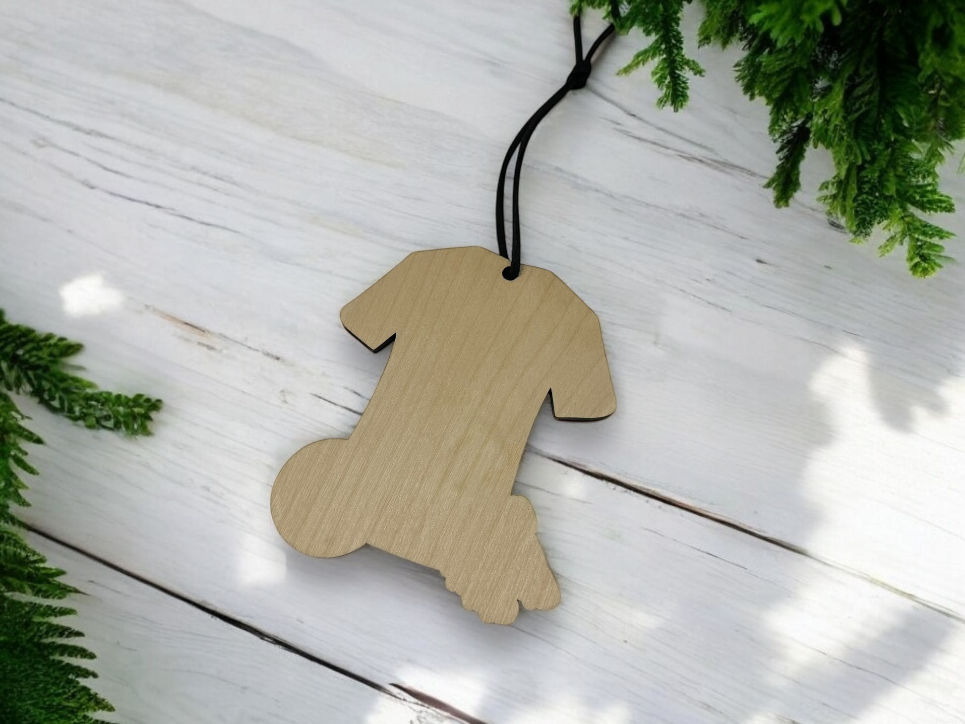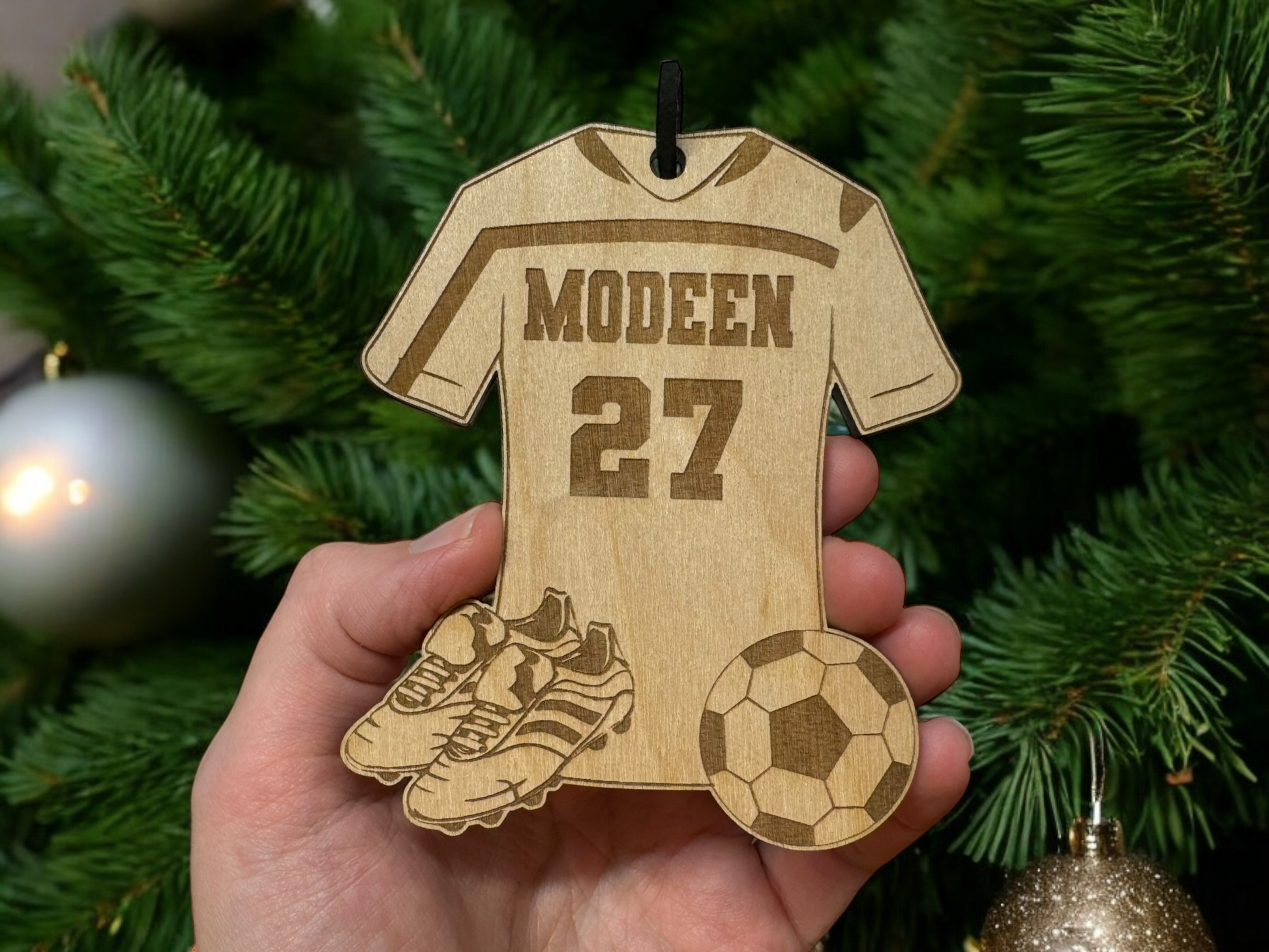 This listing is for one personalized football vest ornament. I laser engrave and cut the wood ornament our of birch plywood and tie a ribbon to hang it from. This soccer design shows a set of cleats and a soccer ball. The jersey measures 3.55" wide and 4.20" tall, its roughly 1/4" thick.